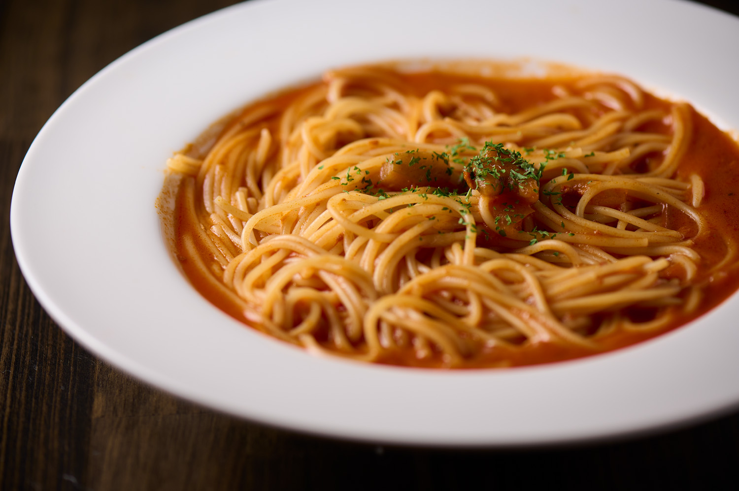 自慢のトマトソースに季節の具材を合わせたトマトソースパスタ。